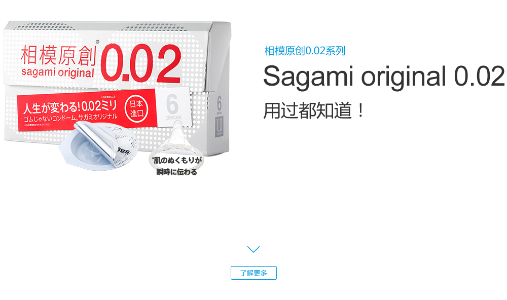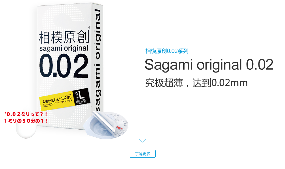 sagami original 0.02 (相模原創(chuàng)0.02系列), 是日本相模橡膠工業(yè)株式會社于1998年推出首次創(chuàng)新發(fā)明并向日本市場的一種以聚氨基甲酸酯 (高分子材料)為原料制成的非乳膠安全套, 厚度僅0.02mm, 是傳統(tǒng)的橡膠產(chǎn)品“厚度一半,強度三倍”, 并且擁有高導(dǎo)熱性能,讓產(chǎn)品使用體驗更加美妙!